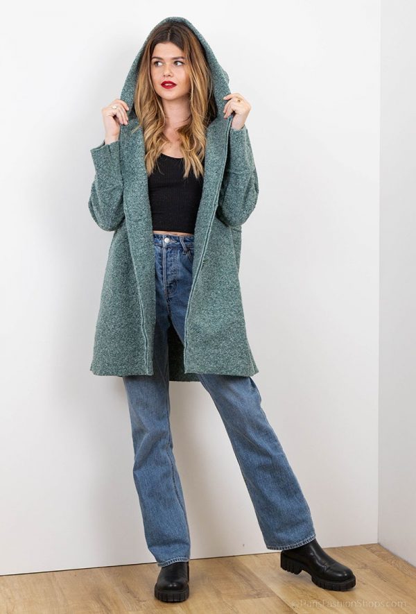 Lækker frakke med lommer, knapluk samt hætte. Farve : Mint. Fremstillet i 70% uld, 30% polyester.