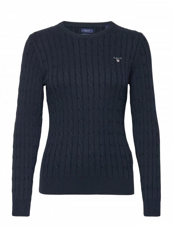 Super lækker Stretch Cotton Cable O-Neck sweater i Evening Blue fra Gant. Perfekt til den stilbevidste kvinde. Fremstillet i 100% bomuld.