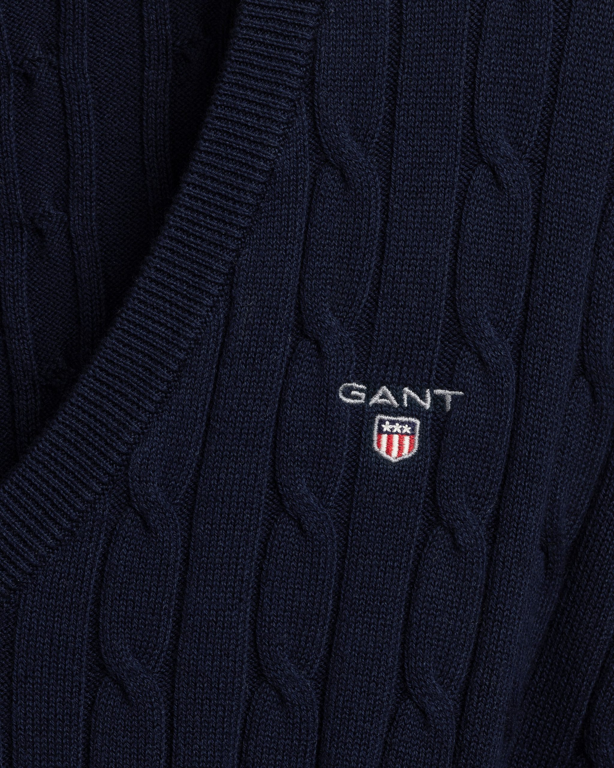 Super lækker Stretch Cotton Cable V-Neck sweater i Evening Blue fra Gant. Perfekt til den stilbevidste kvinde. Fremstillet i 100% bomuld.