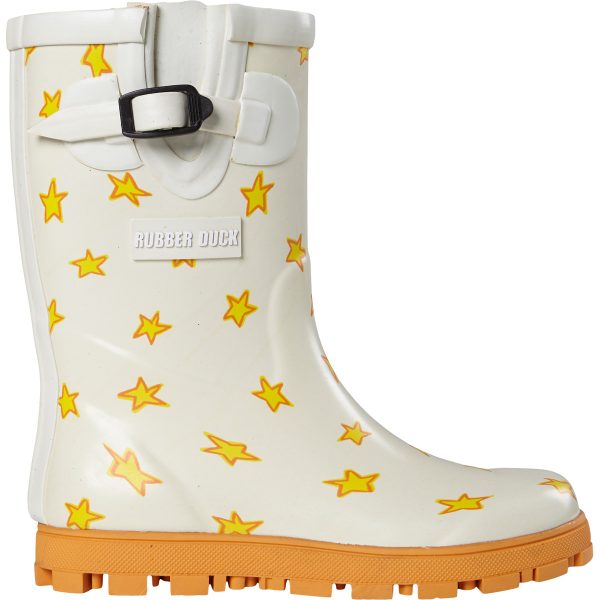 Rubber Duck gummistøvlerne har et højt skaft. På ydersiden er der en praktisk strop med en plastspænde, så de kan strammes ind eller løsnes omkring benet. Indvendigt er de forede med behageligt tekstil, og i bunden er der en blød indersål.