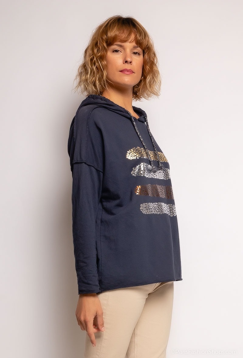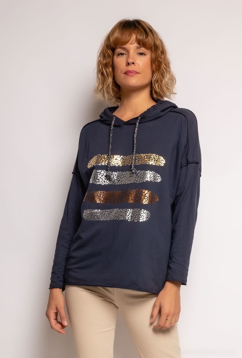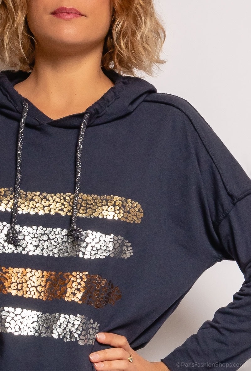 Smart hættetrøje med print. Farve : Navy. Fremstillet i 95% bomuld, 5% elastan.
