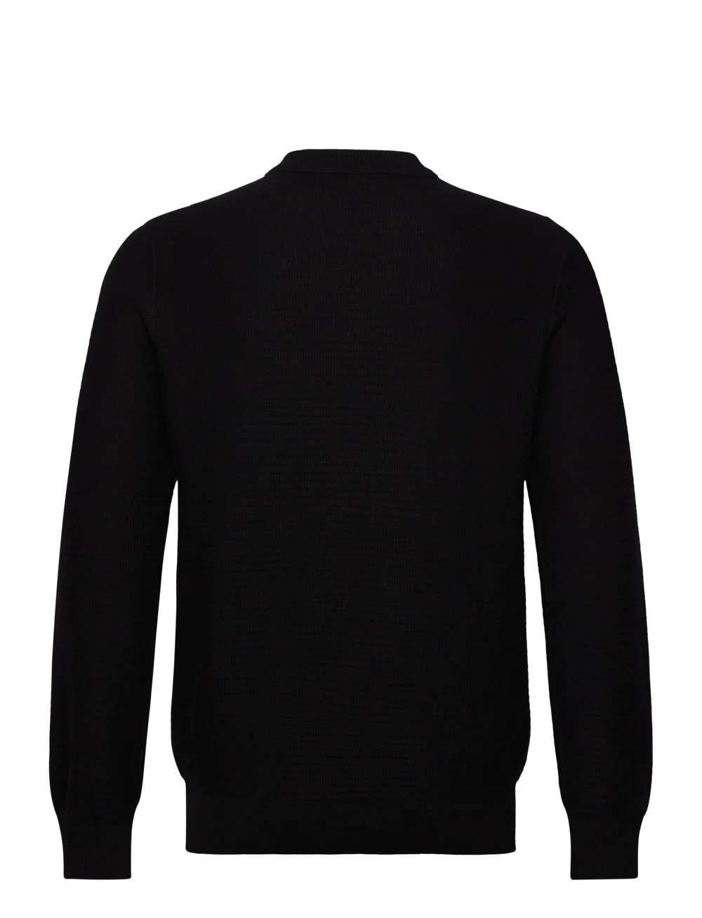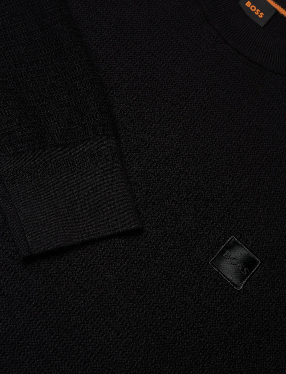 Super flot mønster striktrøje i bedste Hugo Boss kvalitet. Regular fit som giver dig en lettere slank facon uden dog at være slim fit. Med Boss logo på brystet samt rib-kant ved både talje og håndled. Farve: Sort. Fremstillet i 95% bomuld, 5% cashmere.