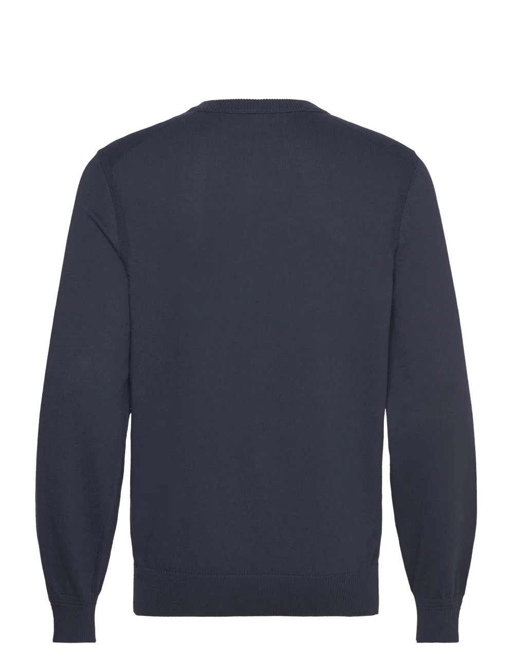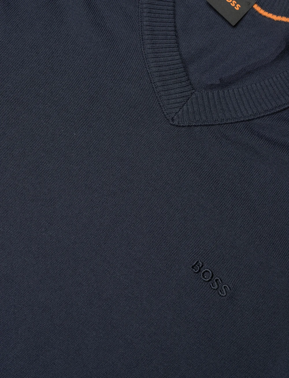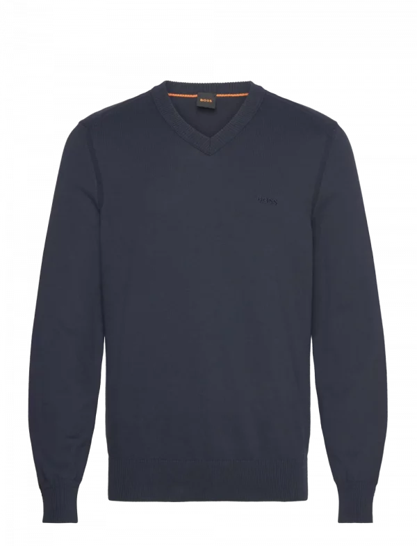 Klassisk striktrøje fra Hugo Boss i lækker kvalitet. Med V-hals og logo på brystet. Classic/Regular fit. Farve: Dark Blue. Fremstillet i 85% bomuld, 15% kapok.