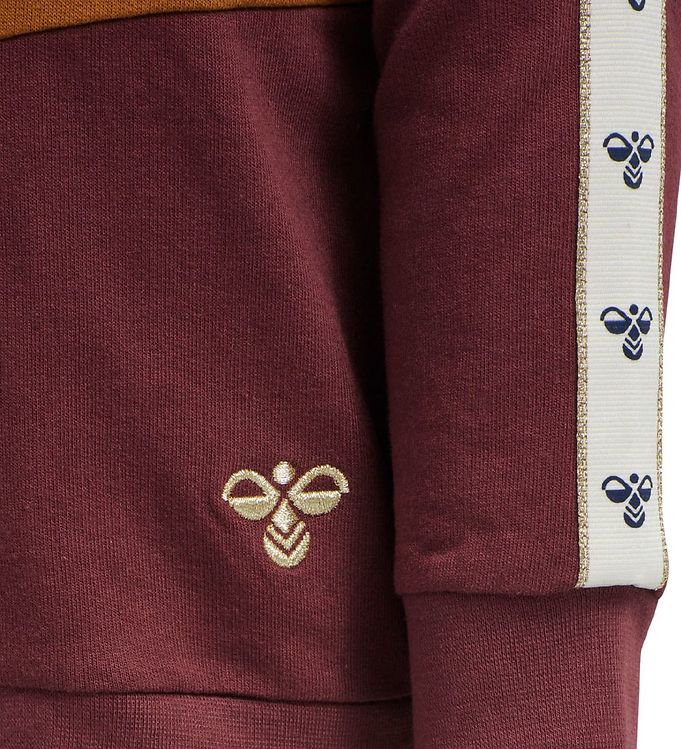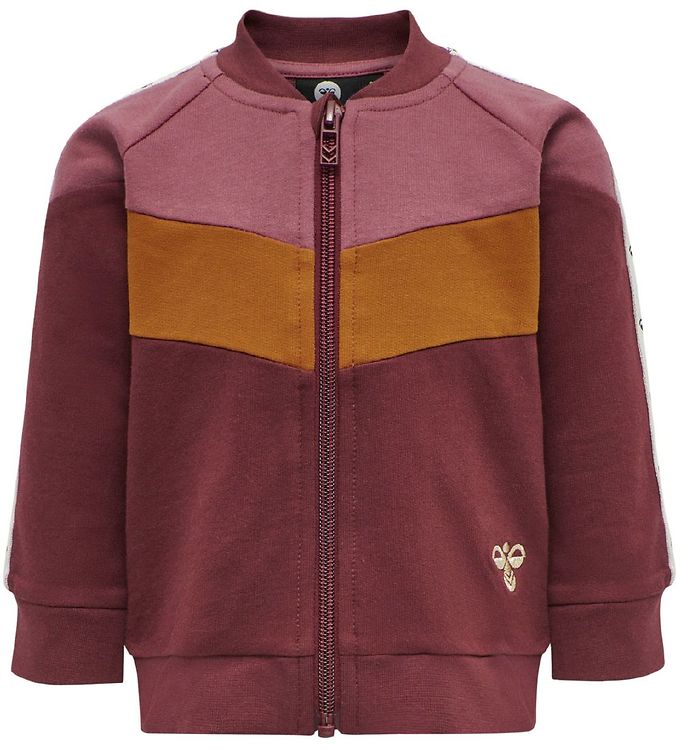 Lækker zip trøje fra Hummel, i bordeaux med støvet rosa samt brændt orange felter over brystet. Ned af begge ærmer er der hvide striber med navy logoer. I venstre side er der et broderet guldlogo. Fremstillet i 100% bomuld.