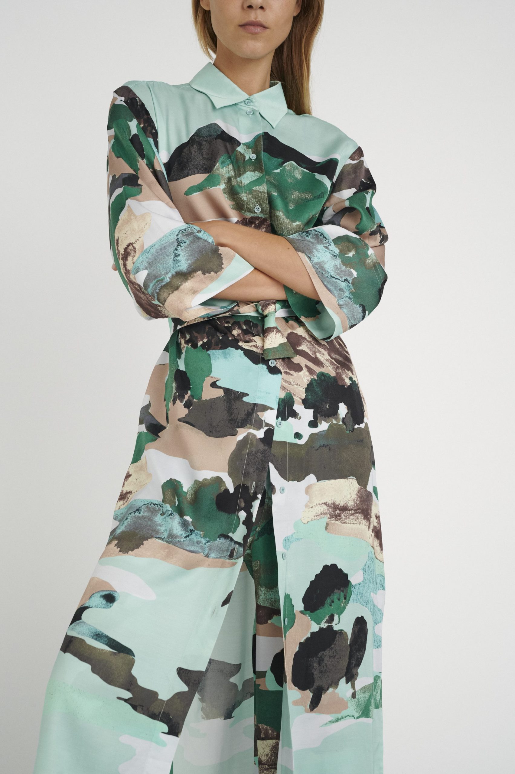 Super flot og stilfuld maxi kjole fra Inwear. Loose fit, ankellængde og knaplukning fortil. Farve : Green Landscape. Fremstillet i 100% viskose.
