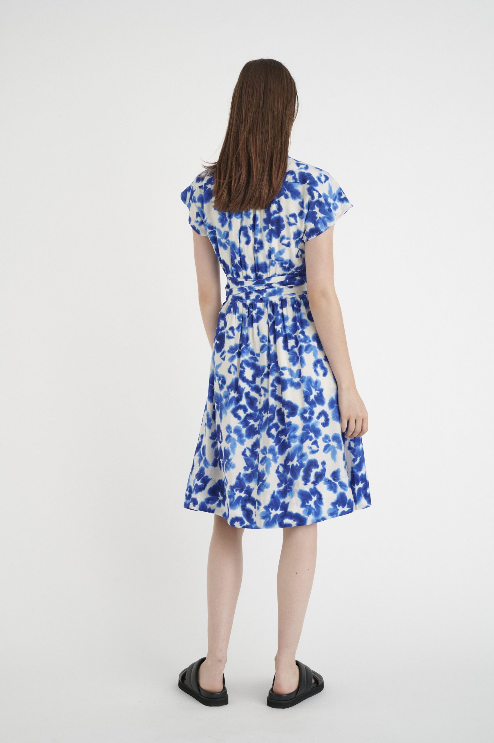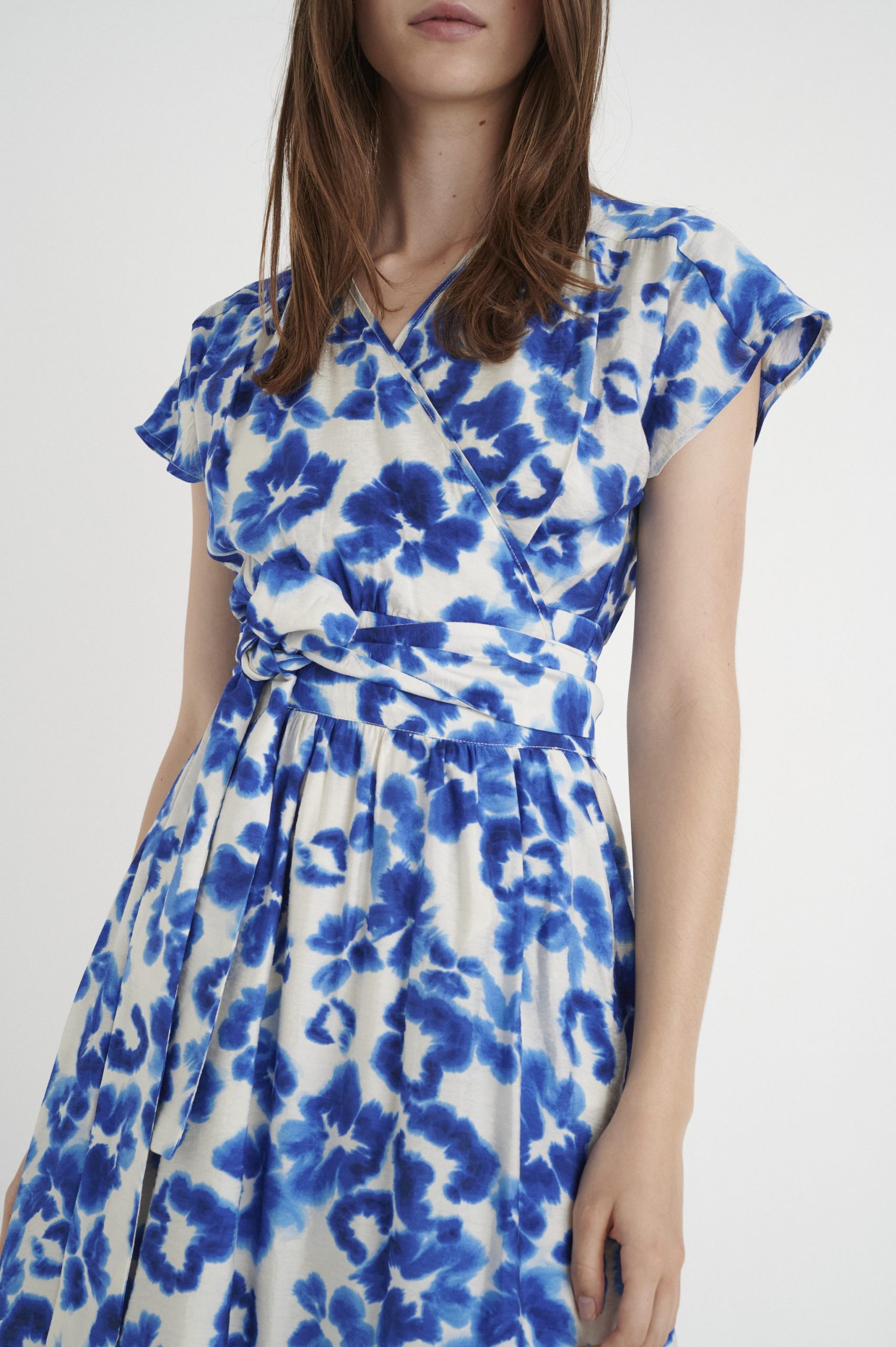 Flot feminin slå om kjole fra Inwear. Knælængde, regular fit. Farve : Blue Poetic Flower. Fremstillet i 85% Viskose (LENZING™ ECOVERO™), 15% Nylon. For : 100% bomuld.