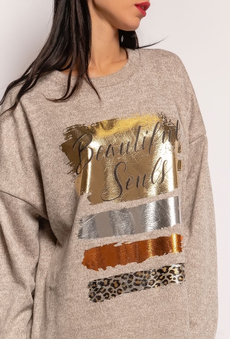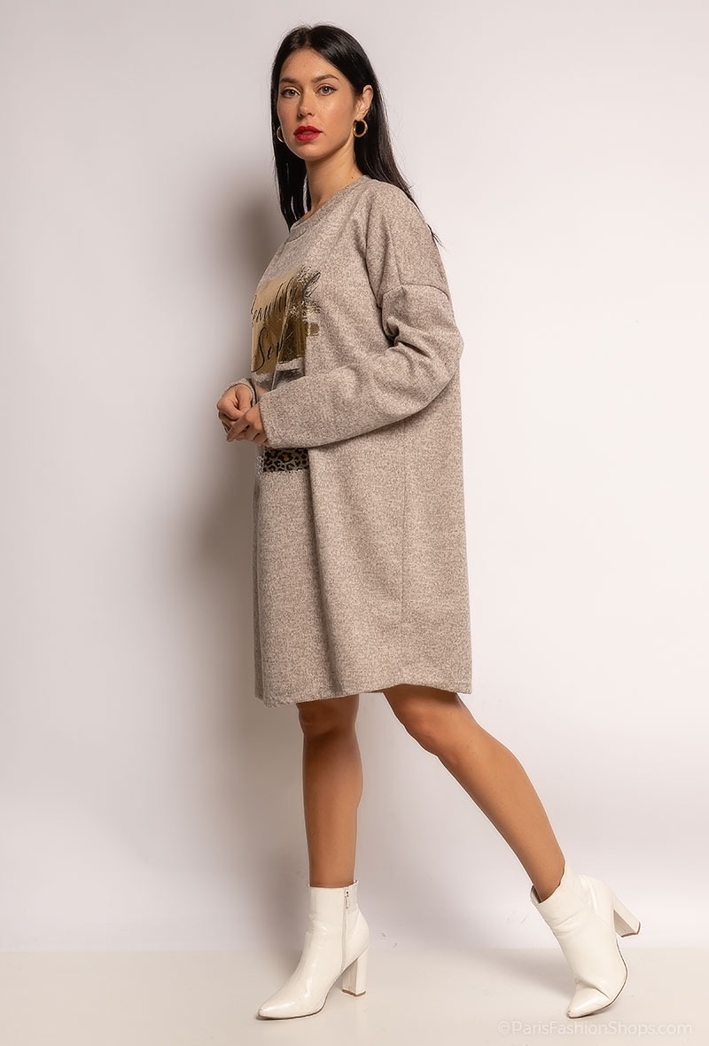 Trendy Knit Dress med metallic print foran. Utrolig blød kvalitet. Modellen er Onesize og passer str. 36 – 42.