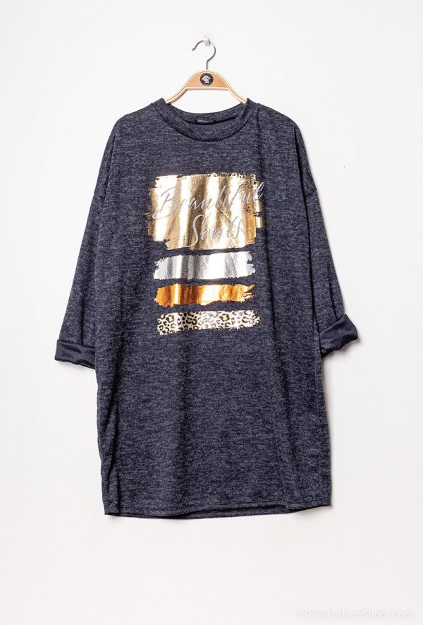 Trendy Knit Dress med metallic print foran. Utrolig blød kvalitet. Modellen er Onesize og passer str. 36 – 42.