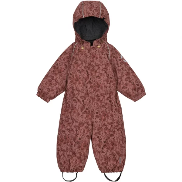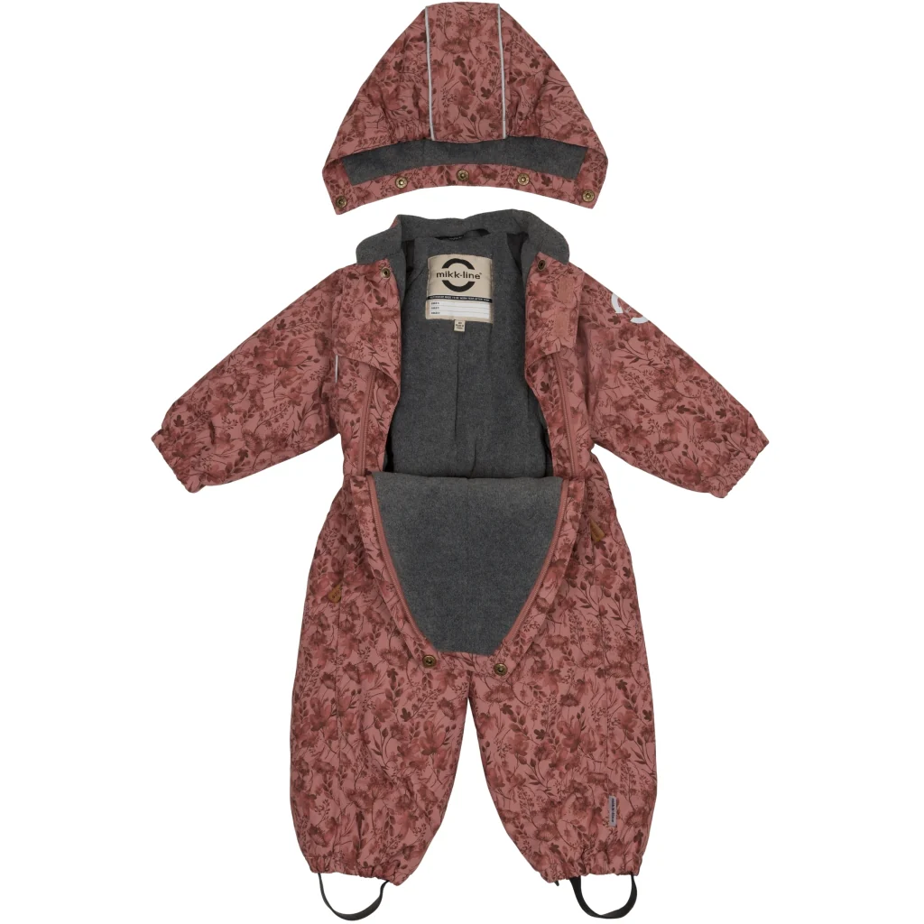Mikk-line baby flyverdragt med et fint, blomstret print. I denne lækre flyverdragt kan barnet lege og udforske naturen under den åbne himmel i alt slags vejr i løbet af de kolde og våde efterår- og vintermåneder. Flyverdragten er lavet af genanvendt polyester og polstret med polyesterfyld. Hætten og overkroppen har blødt fleece foer, hvorimod ærmerne og benene har en glat og gnidningsfri indvendig overflade. Vi har anvendt Solution Dye til farvning af det glatte for, da det bl.a. mindsker forbruget af vand i produktionen. Den er naturligvis også fluorfri med BIONIC-FINISH® ECO imprægnering.
