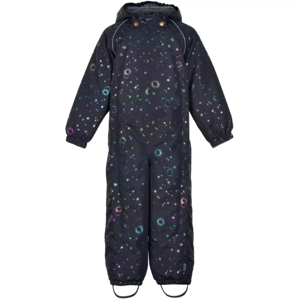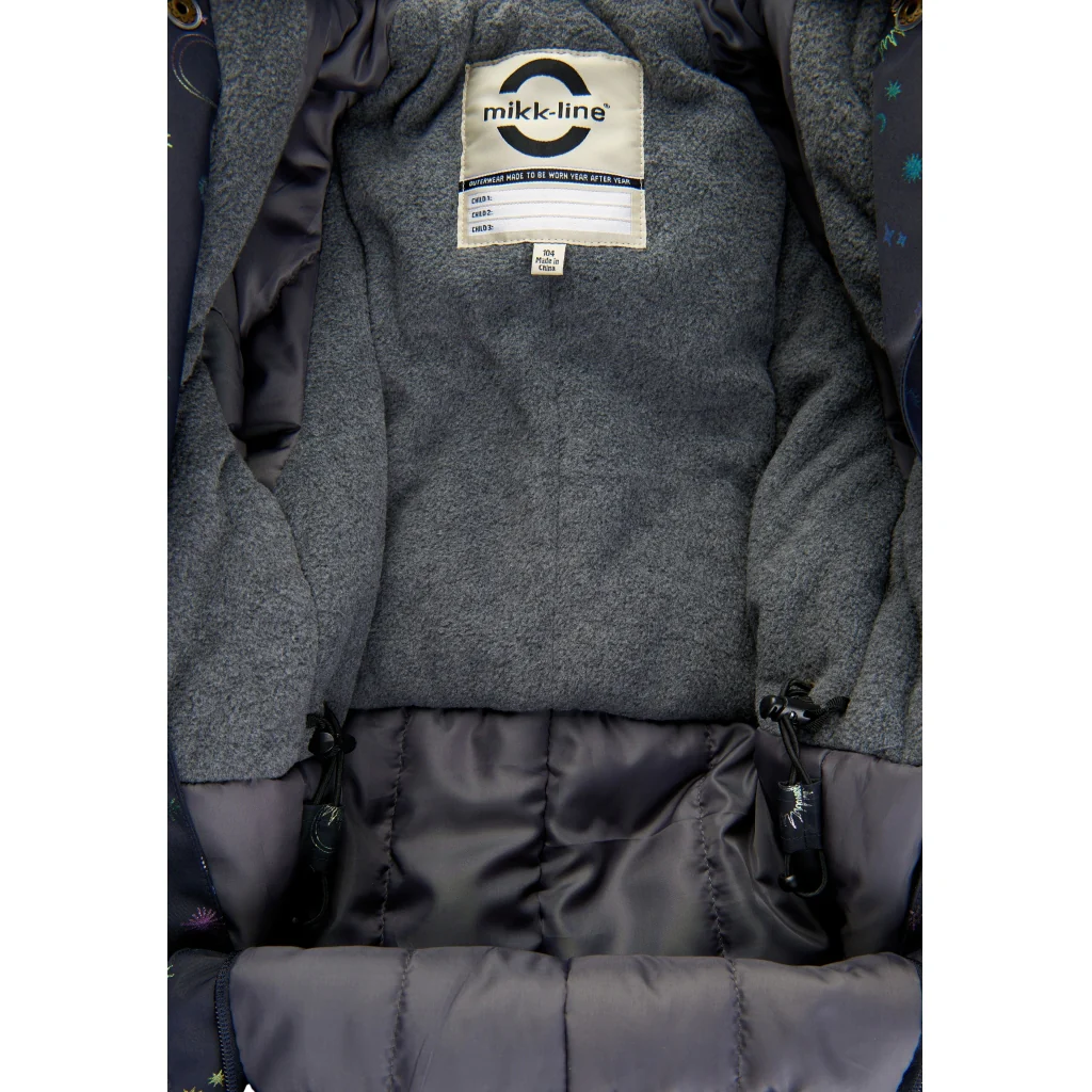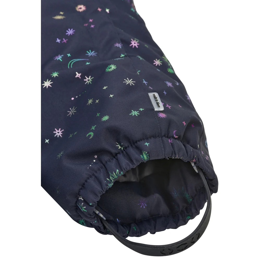 Mikk-line flyverdragt med et farverigt glitterprint af stjerner og måner. I denne lækre flyverdragt kan barnet lege og udforske naturen under den åbne himmel i alt slags vejr i løbet af de kolde og våde efterår- og vintermåneder. Flyverdragten er lavet af genanvendt polyester og polstret med polyesterfyld. Hætten og overkroppen har blødt fleece foer, hvorimod ærmerne og benene har en glat og gnidningsfri indvendig overflade. Vi har anvendt Solution Dye til farvning af det glatte for, da det bl.a. mindsker forbruget af vand i produktionen. Den er naturligvis også fluorfri med BIONIC-FINISH® ECO imprægnering.