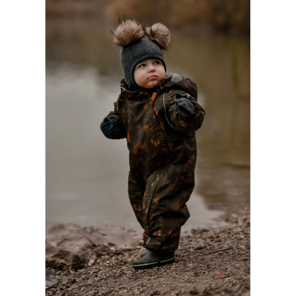 Mikk-line flyverdragt med et sejt print af vinterlandskab og skovens dyr. I denne lækre flyverdragt kan barnet lege og udforske naturen under den åbne himmel i alt slags vejr i løbet af de kolde og våde efterår- og vintermåneder. Flyverdragten er lavet af genanvendt polyester og polstret med polyesterfyld. Hætten og overkroppen har blødt fleece foer, hvorimod ærmerne og benene har en glat og gnidningsfri indvendig overflade. Vi har anvendt Solution Dye til farvning af det glatte for, da det bl.a. mindsker forbruget af vand i produktionen. Den er naturligvis også fluorfri med BIONIC-FINISH® ECO imprægnering.