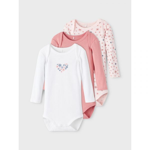 Skønne farver og mønstre på de 3 bodyer: den ene er hvid med et lille hjerte foran i blomster print. Den anden er ensfarvet i en skøn rosa og den tredje er rosa med blomsterprint