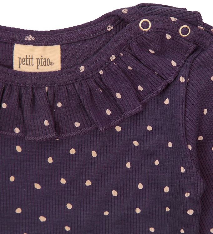 Sød langærmet body fra Petit Piao. Med fint print og flæse ved halsåbningen. Lavet i en dejlig blød og strækbar kvalitet. Farve : Mysterioso/Gull Gray. Fremstillet i 48% økologisk bomuld, 48% modal, 4% elastan.
