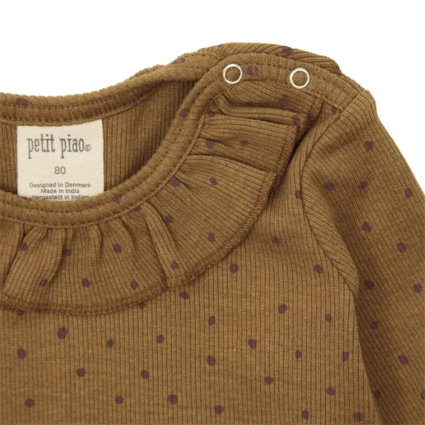 Fin Petit Piao kjole i en brun ribstruktur, med små prikker i rød over det hele. I halsen er der en bred flæse. Kjolen har lange ærmer og en rund halsudskæring. Kjolen kan åbnes over venstre skulder med praktiske trykknapper. Skørtet har fine folder fra en smal syning omkring livet. Farve : Rubber/Copper Brown. Fremstillet i 48% økologisk bomuld, 48% modal, 4% elastan.