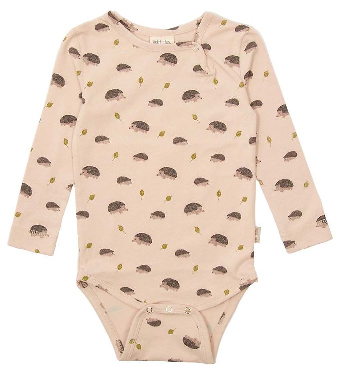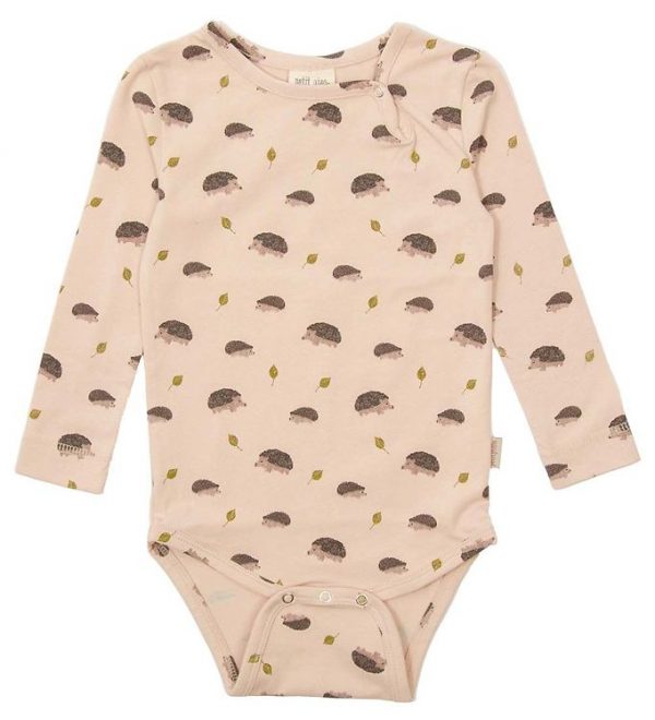 Sød Petit Piao body i rosa, med print af pindsvin og blade. Med lange ærmer og smalle kanter. Bodyen åbnes foran den venstre skulder med en trykknap, og mellem benene er der tre trykknapper. Bodyen er strækbar og fremstillet af en lækker bomuldskvalitet. Farve : Rosa. Fremstillet i 95% økologisk bomuld, 5% elastan.