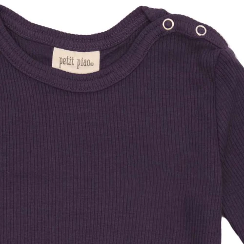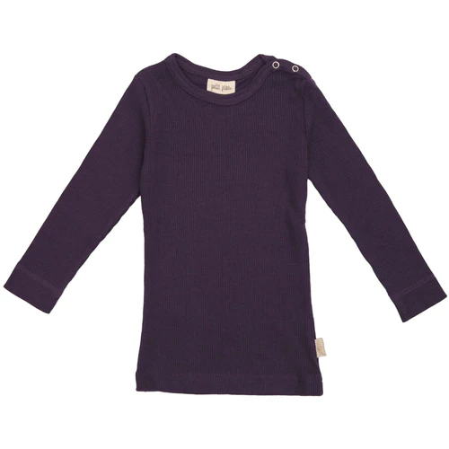 Lækker bluse i en blød merinould med lange ærmer fra Petit Piao. I en flot mørkelilla farve med to trykknapper på venstre skulder. Fremstillet i 100% Merino uld.