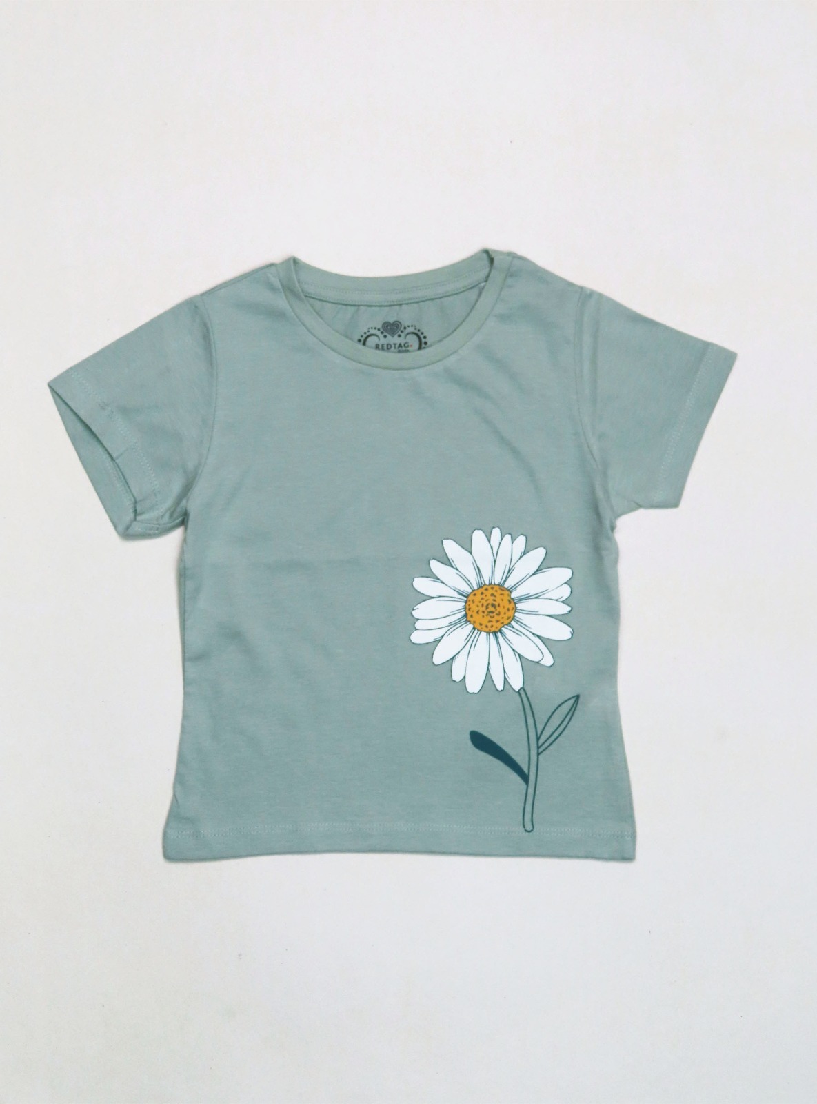 Sød t-shirt med fint blomster motiv. Farve : Dusty Green. Fremstillet i 100% bomuld.