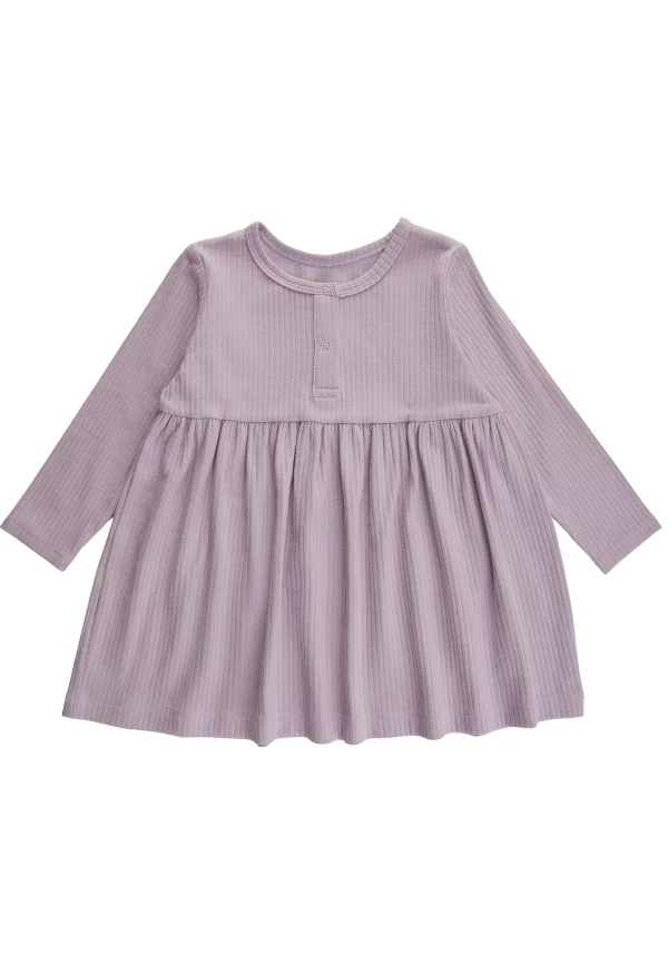 SGJenni er en sød langærmet kjole med et bredt ribmønster. Kjolen er simpel men elegant, og så er den lavet i en meget blød kvalitet med stræk, som gør den yderst behagelig for dit barn. Bodyen har to trykknapper fra kraven og ned på brystet, samt en overskæring som fint fremhæver kjolens skørt.