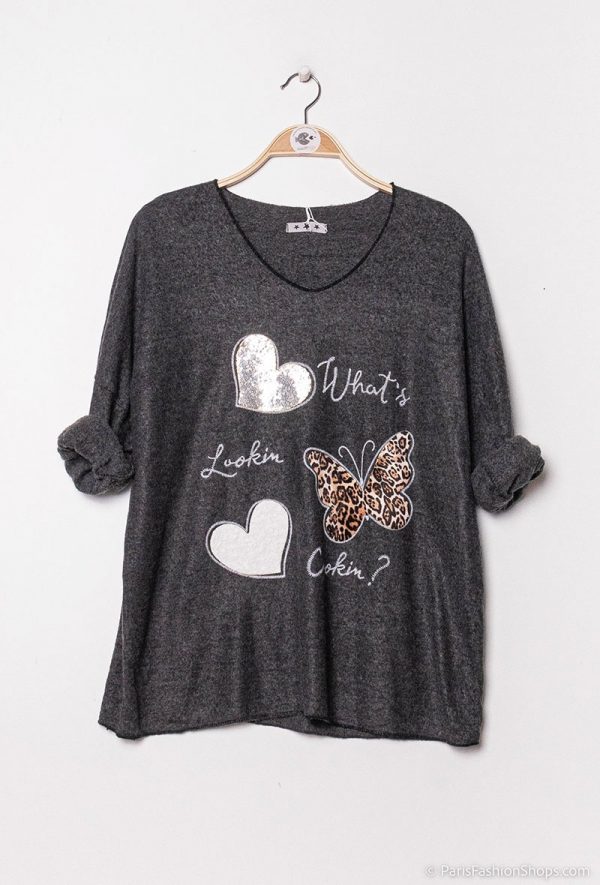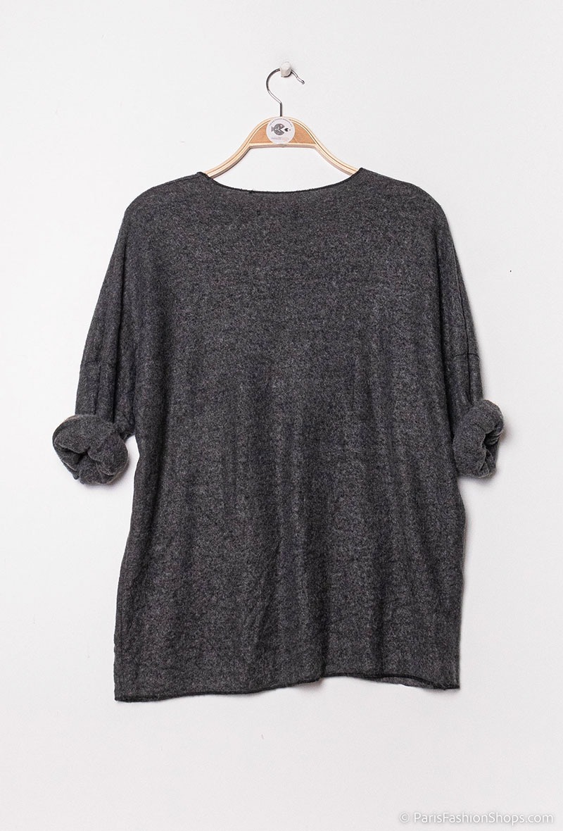 Dejlig blød sweater med fine motiver foran. Farve : Dark Grey. Fremstillet i 65% viscose, 30% uld, 5% elastan.