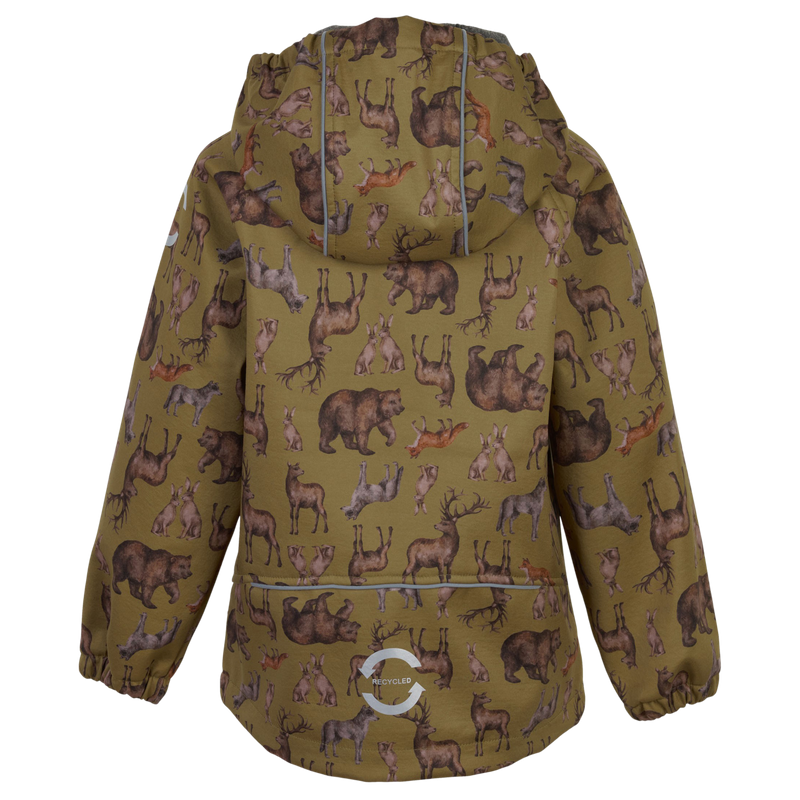 Mikk-line unisex softshell jakke med print af dyr. Jakken har gennemgående lynlåslukning, to lommer med lynlås, ærmer med elastikkant samt aftagelig hætte, som sidder fast med trykknapper. Hætten har en elastikkant i begge sider af ansigtsåbningen, som gør at den sidder tæt og tilpasser sig om hovedet. Jakken har elastik i taljen samt refleksdetaljer, der gør dit barn synligt i trafikken.