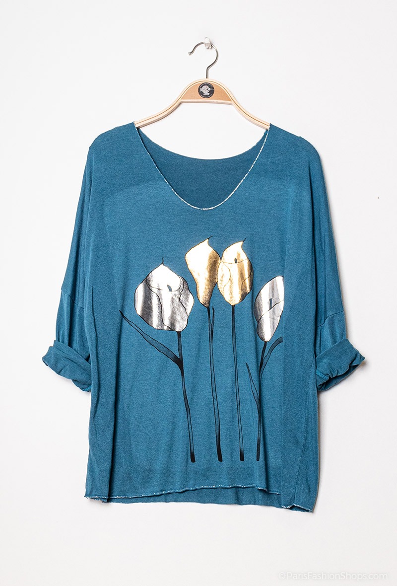 Super sød bluse med fint metallic blomsterprint. Let og løstsiddende kvalitet. Farve : Petroleum. Fremstillet i 95% bomuld, 5% elastan.