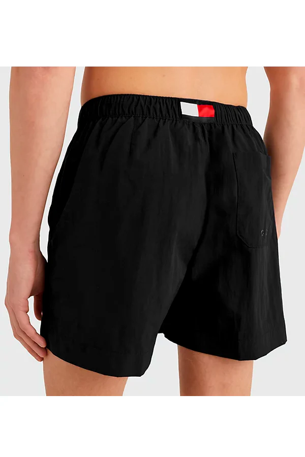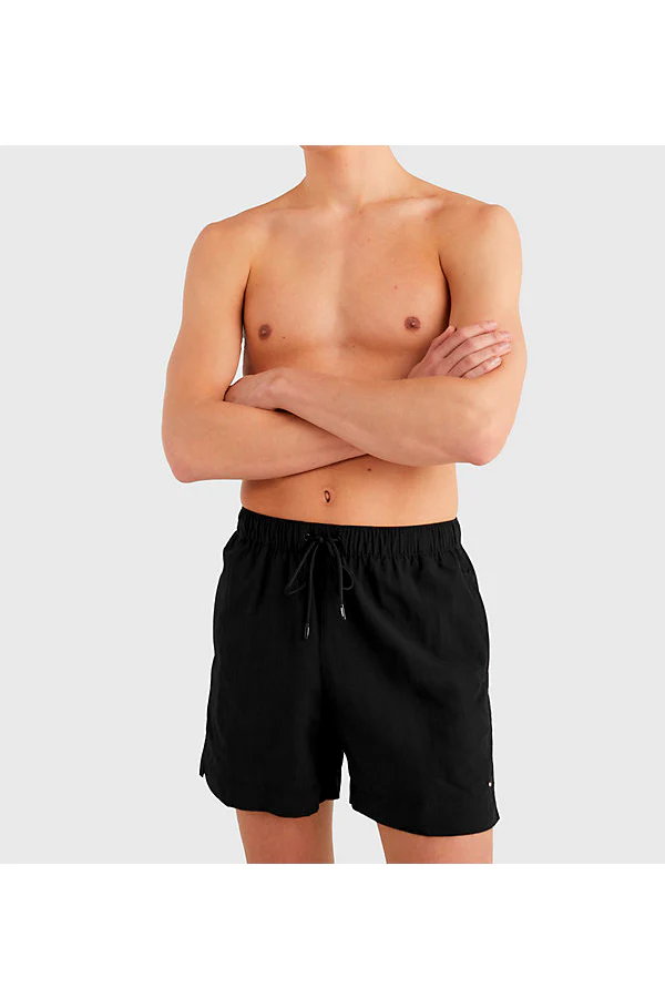 Stilfulde badeshort fra Tommy Hilfiger. Lavet i en holdbar kvalitet, med 3 lommer, logo på venstre lår og elastik snøre i livet. Regular fit. Farve: Black. Fremstillet i 100% genanvendt polyester.