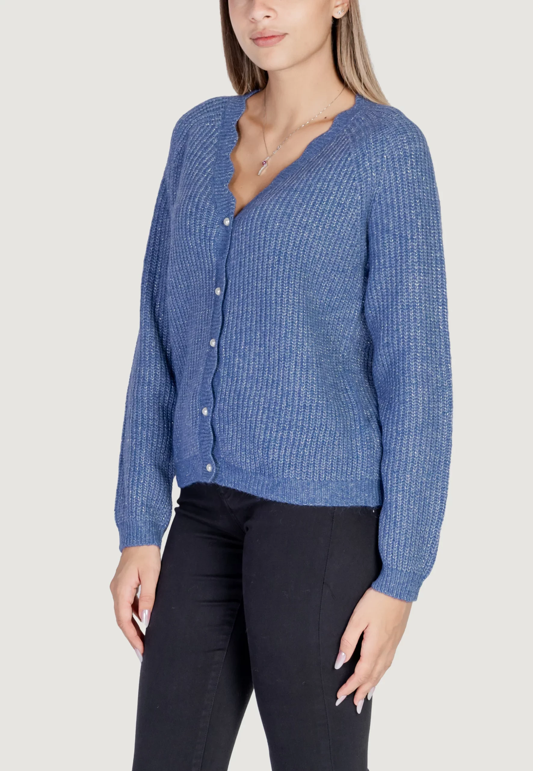 Smart strik cardigan i bedste Vila kvalitet. Farve: Bijou Blue/Silver. Fremstillet i 50% Recycled Polyester, 25% Polyamide, 20% Acrylic, 5% Polyester.