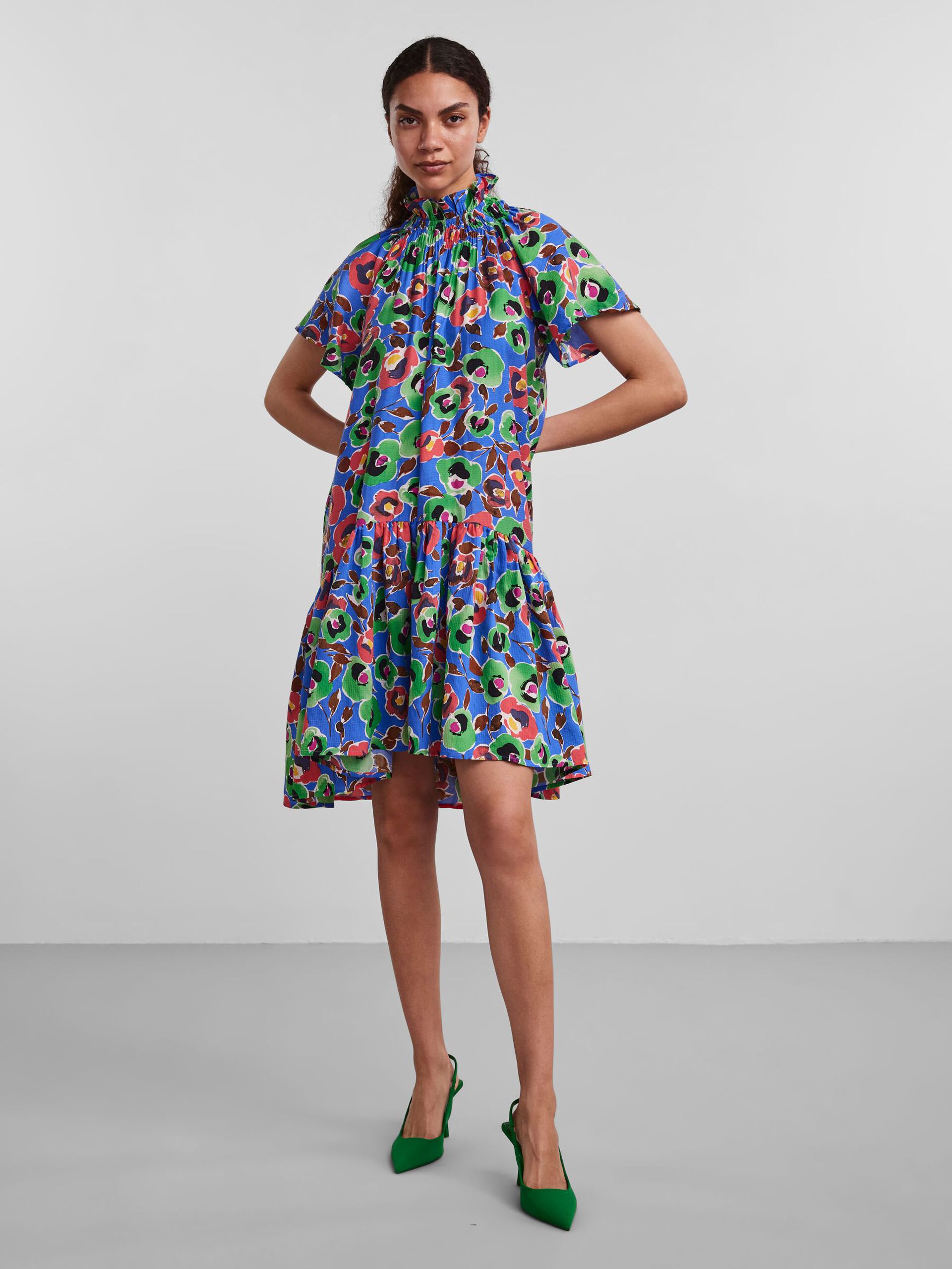Smuk sommerkjole fra Y.A.S med korte raglan ærmer. Flæsekrave og rynkede detaljer i halsudskæringen. Løs pasform og fint blomster mønster. Farve : Ultramarine. Fremstillet i 85% viscose, 15% nylon.